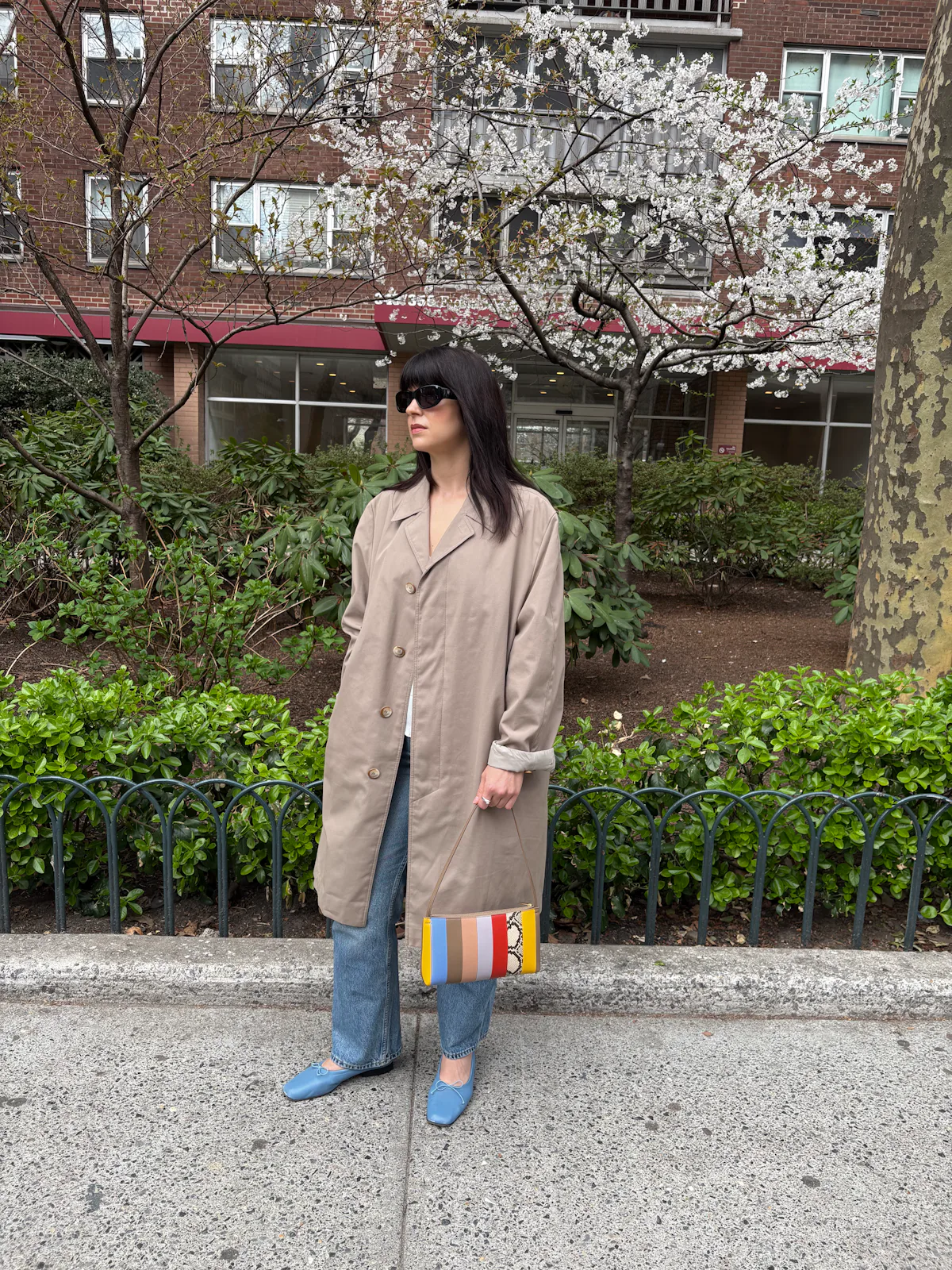 “The Gaia Shoulder Bag is my new 24/7 accessory — it’s sleek and dressy enough to wear on nights out, but it’s roomy enough to hold all of my daytime essentials. I first took the bag for a spin on a workday and I was surprised I could comfortably fit my medium-sized wallet, sunglasses, phone, lipstick, and keys inside. Beyond the versatile shape and size, the colorful leather patchwork design feels so unique and will complement a range of outfits, whether you lean maximalist or minimalist. Case in point: The bag added visual interest to my springtime throw-it-on-and-go outfit of an oversized trench, a white blouse, straight leg jeans, and ballet flats.”